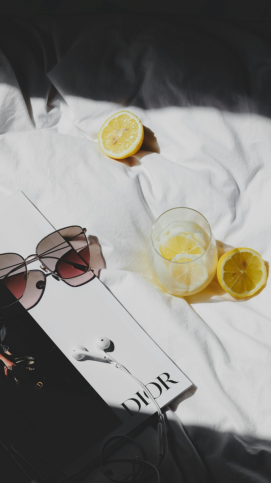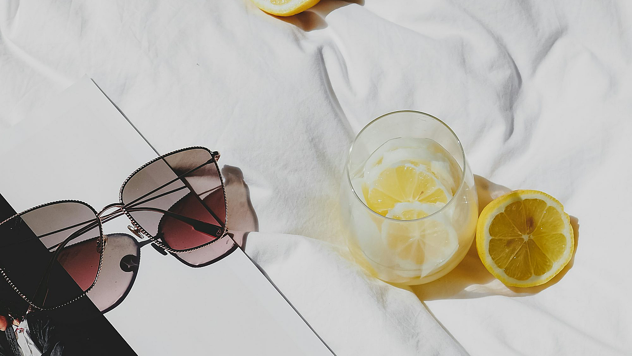 A vibrant wallpaper featuring a book, sunglasses, and lemons resting on a bed. Perfect for a summery, relaxing vibe.