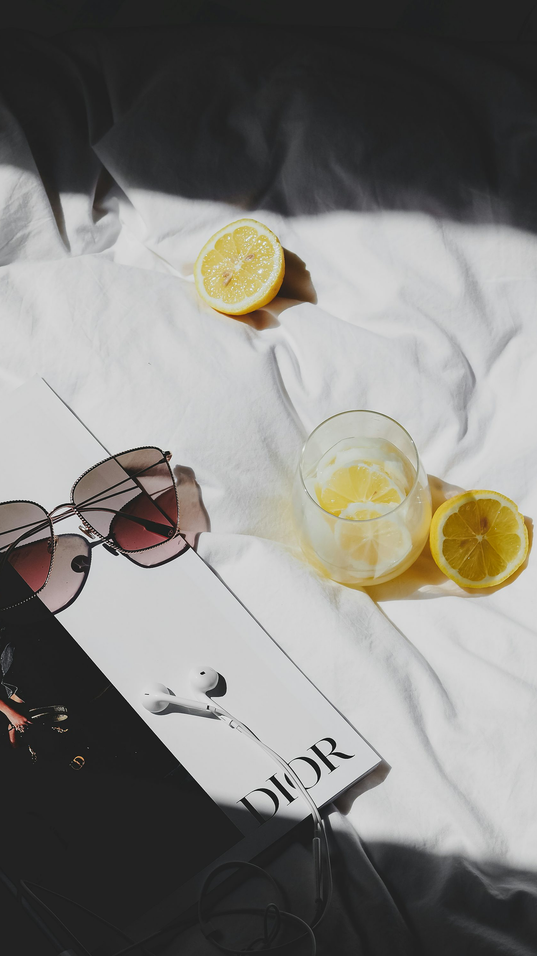 book, sunglasses, lemons, bed, summer, reading, relaxation, citrus, yellow, vintage