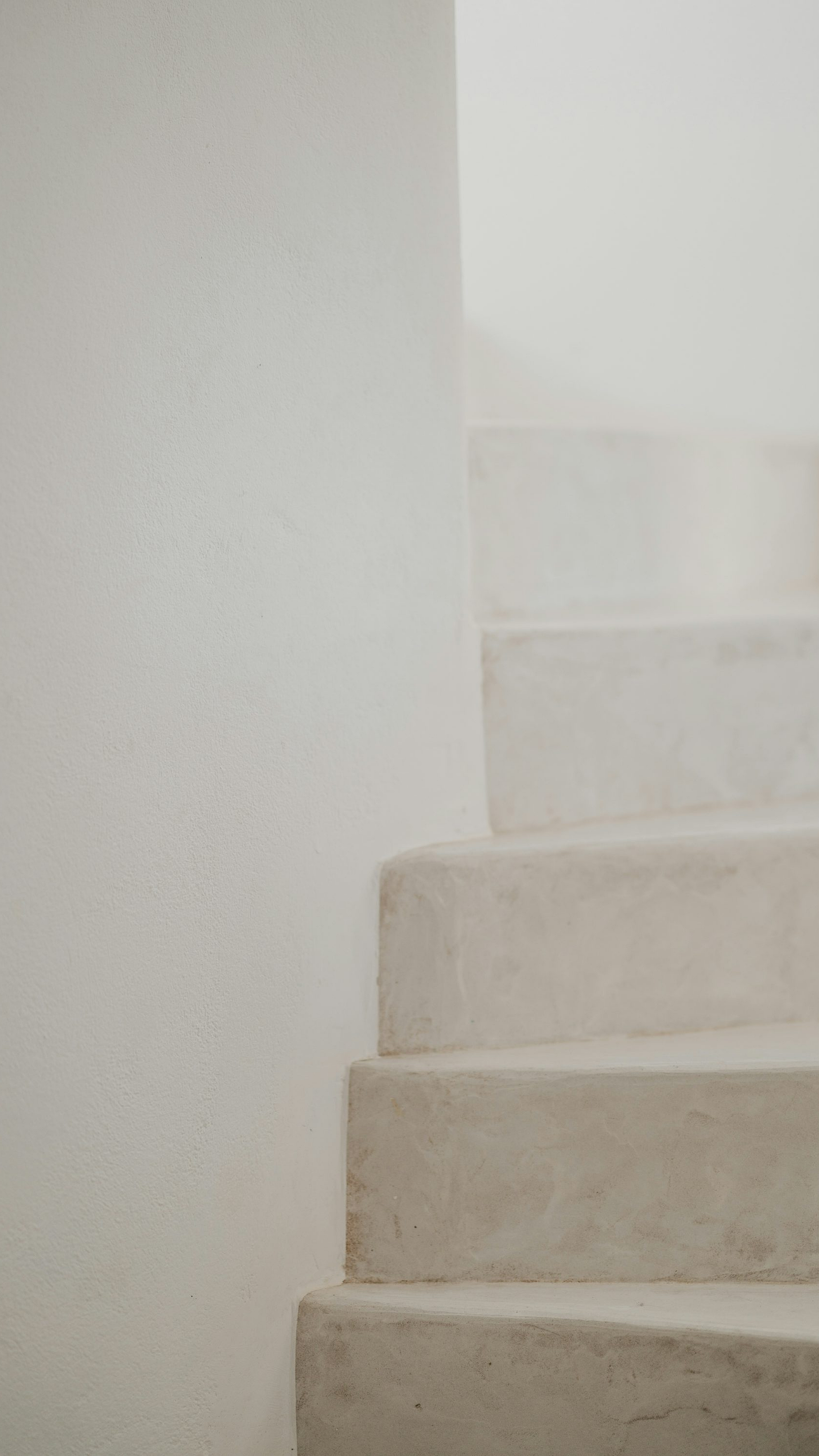 A crisp, clean image of a set of white stairs in close-up. Perfect for a minimalist or modern aesthetic.