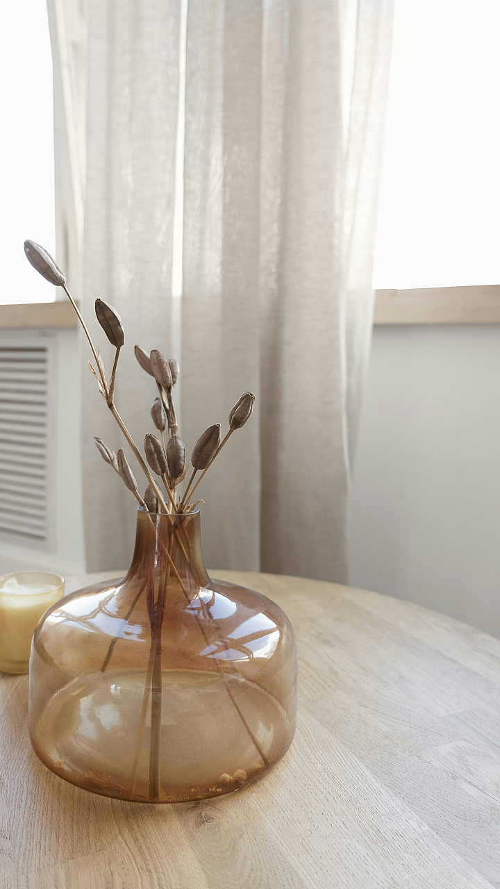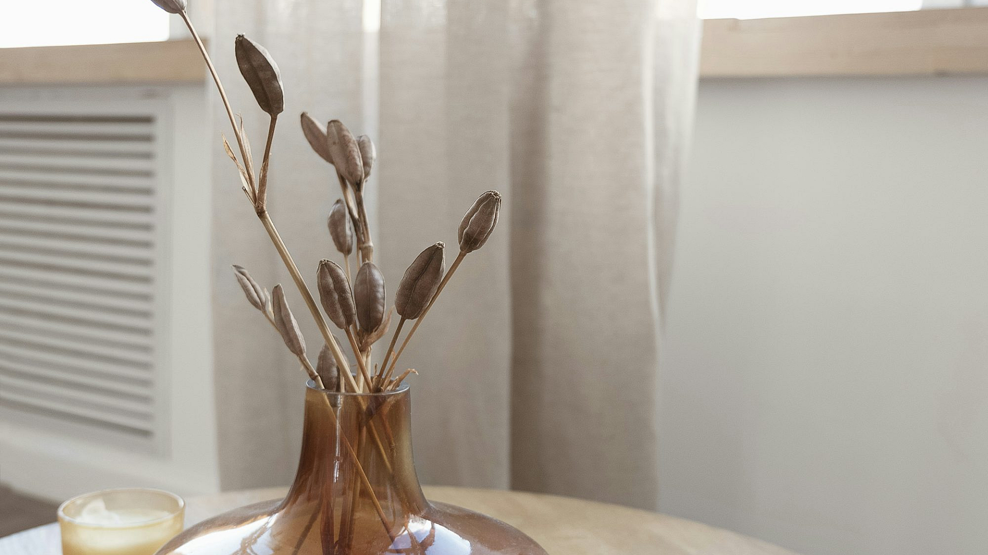 A serene wallpaper featuring a simple table setting with a vase and a lit candle. Perfect for a calming atmosphere.