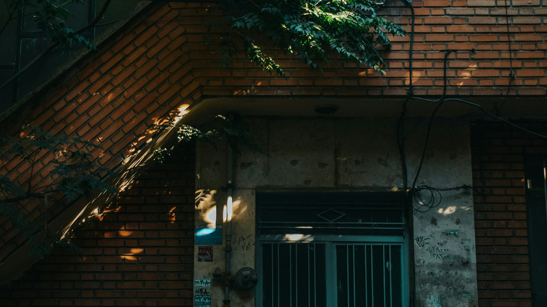 This wallpaper features a striking image of a tall brick building, accented by a vibrant green door. The texture and detail are beautifully captured.