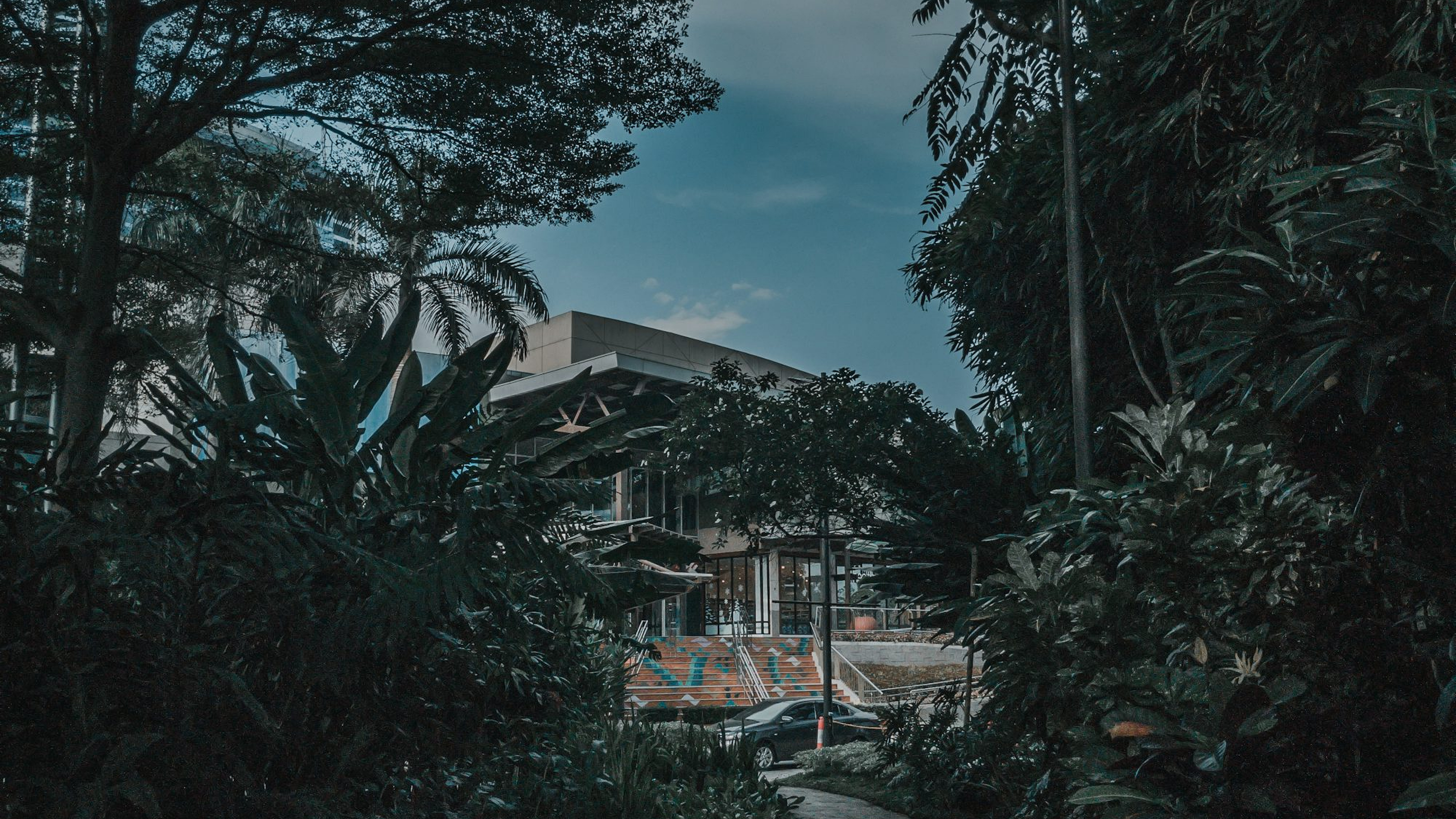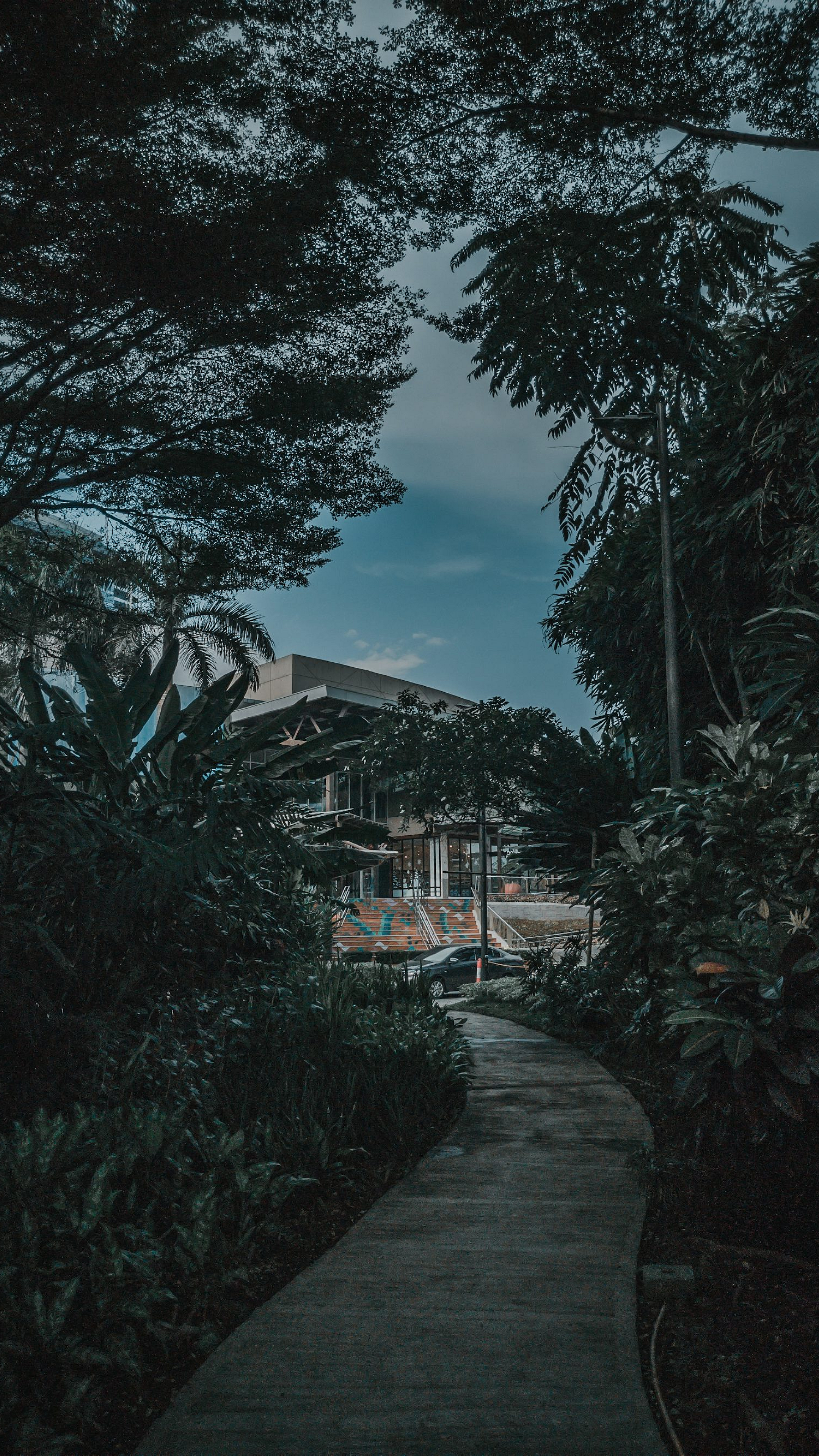 gray concrete pathway, high-rise building, green trees, blue sky, white clouds, cityscape, architecture, nature, urban landscape, wallpaper
