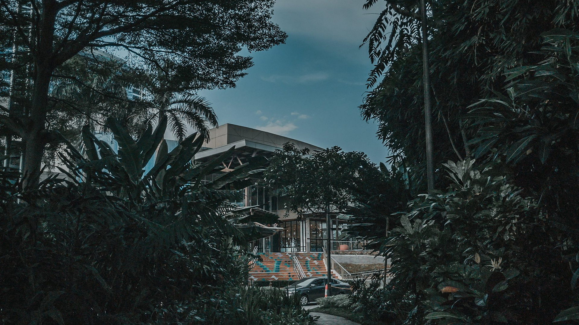 A stunning wallpaper featuring a gray concrete pathway leading towards towering high-rise buildings nestled amidst lush green trees under a vibrant blue and white sky.