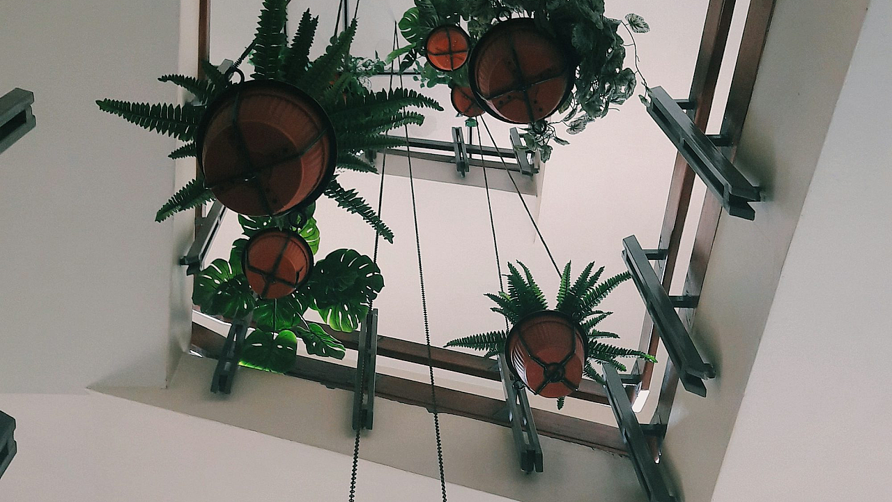 low angle, plant pots, hanging plants, ceiling plants, indoor plants, green, plants, photography, wallpaper, home decor