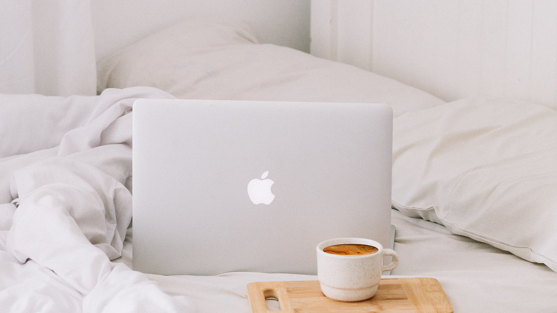 A serene image depicting a MacBook resting next to a teacup of latte, perfect for a calming desktop background.
