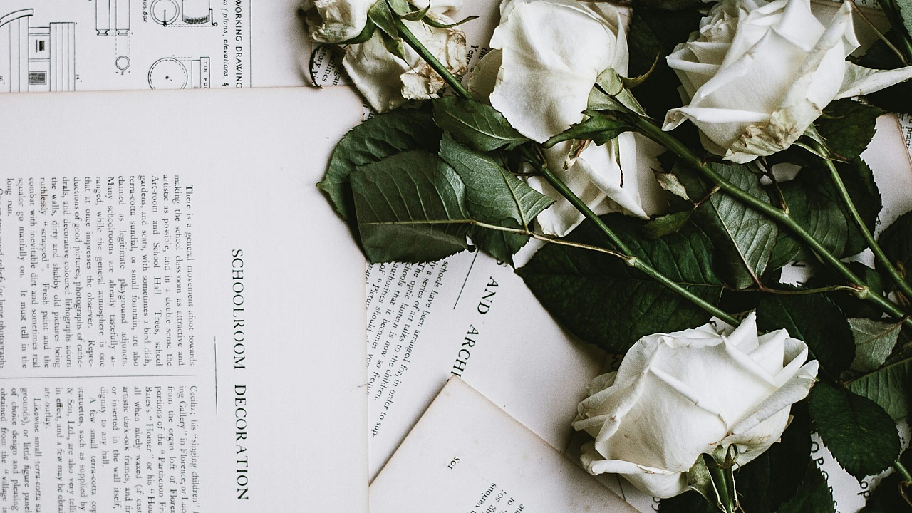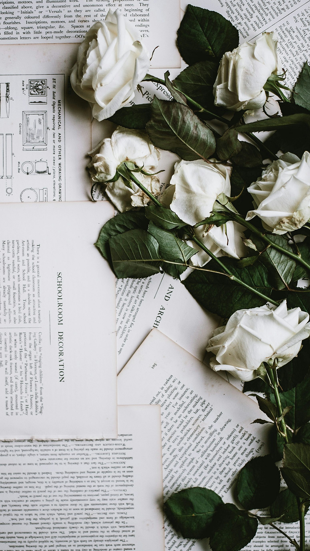A minimalist wallpaper featuring six white roses delicately arranged on a background of white printer paper, creating a clean and elegant aesthetic.