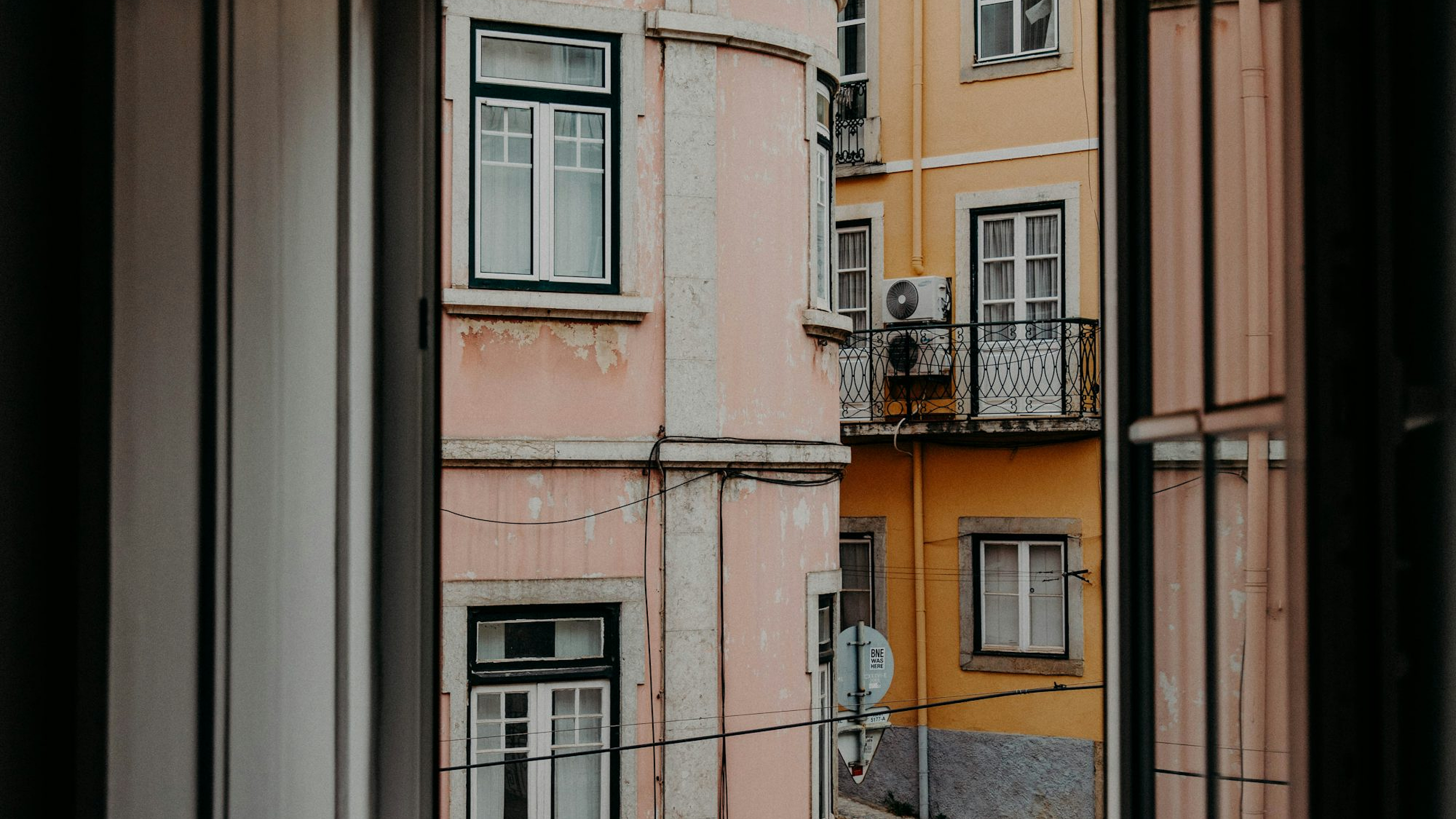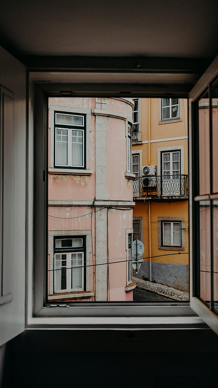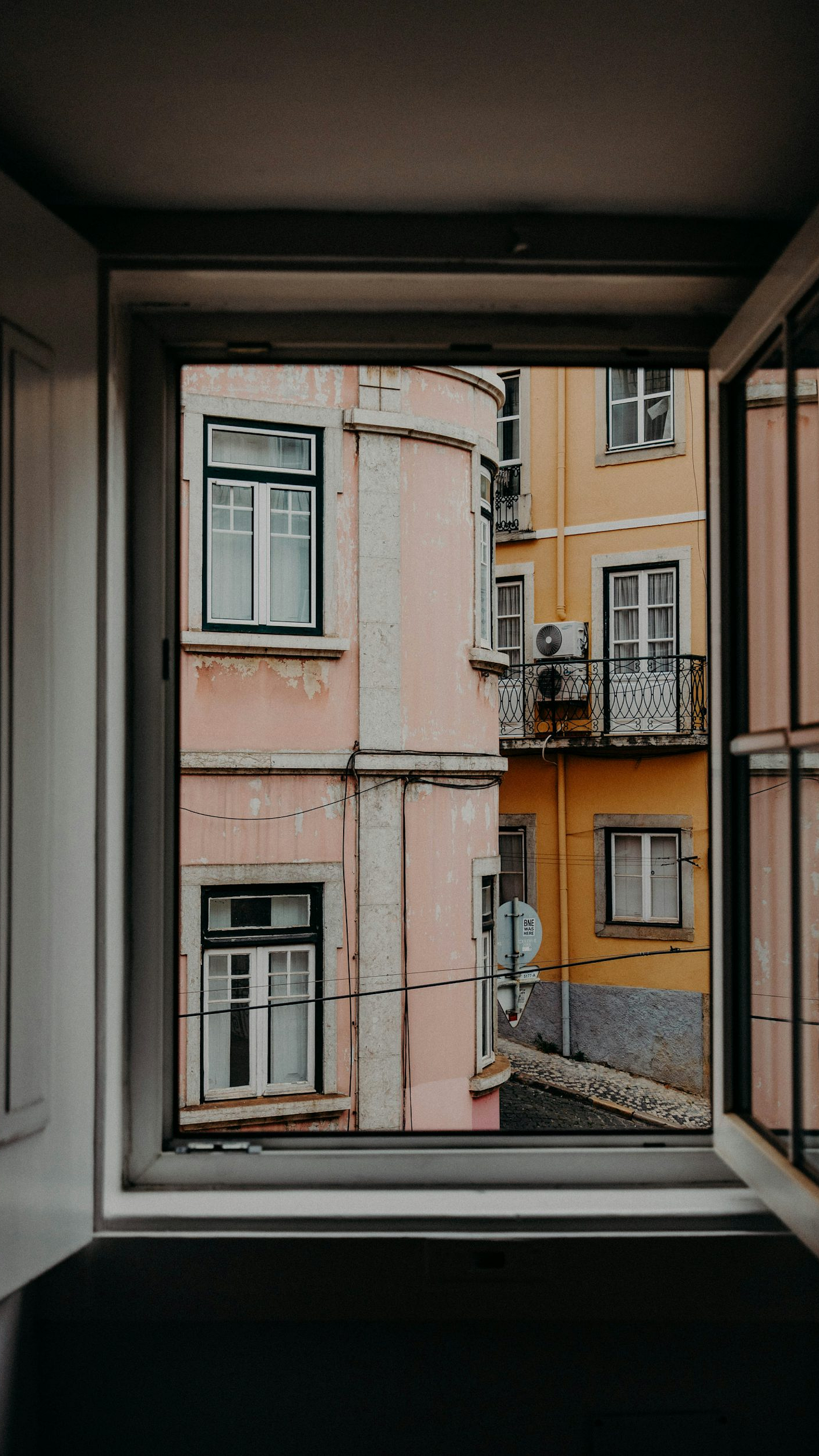 wooden window, opened window, concrete buildings, city view, urban landscape, architecture, wallpaper, background, texture, contrast